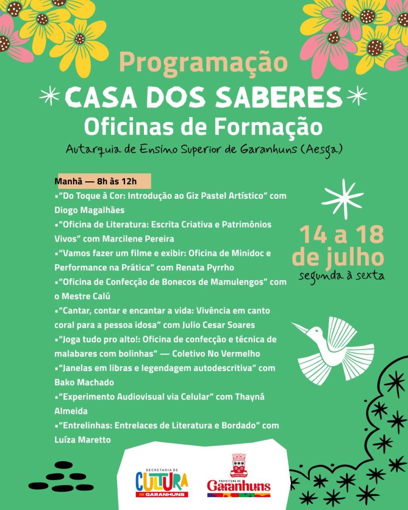 As oficinas serão realizadas na Casa dos Saberes, na Autarquia de Ensino Superior de Garanhuns (Aesga), de 14 a 18 de julho, com atividades distribuídas entre os turnos da manhã e da tarde. As inscrições são feitas por meio de uma plataforma online, onde é preciso informar os dados pessoais e, em seguida, selecionar a oficina desejada.