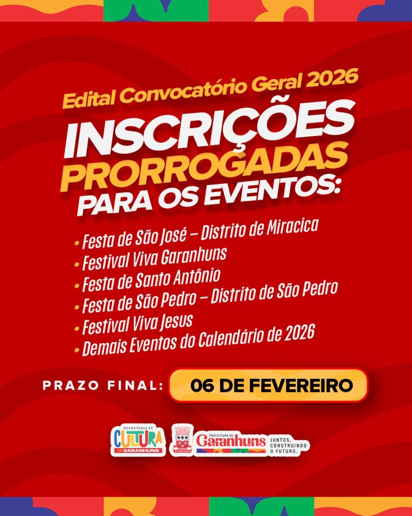A Prefeitura de Garanhuns, por meio da Secretaria Municipal de Cultura, prorroga as inscrições para os eventos que fazem parte do Edital Convocatório Geral de 2026, com prazo estendido até o dia 06 de fevereiro. Com exceção das inscrições para o Carnaval nos Bairros e Garanhuns Jazz Festival, que serão encerradas nesta sexta-feira (23).