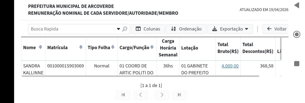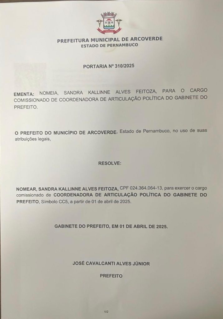 Um documento oficial da Prefeitura de Arcoverde mostra a nomeação de Sandra Kallinne Alves Feitoza para o cargo comissionado de Coordenadora de Articulação Política do gabinete do prefeito. A portaria é datada de 1º de abril de 2025 e leva a assinatura do prefeito José Cavalcanti Alves Júnior.