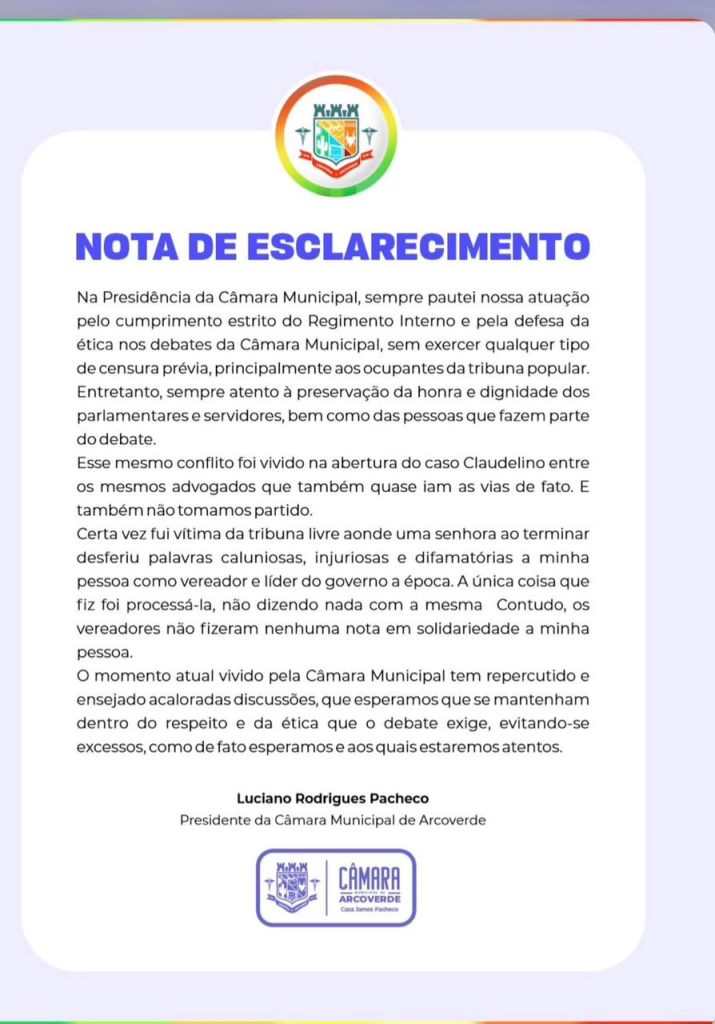 O presidente da Câmara de Arcoverde, Luciano Pacheco, divulgou uma nota de esclarecimento após a sessão marcada por confusão no plenário.