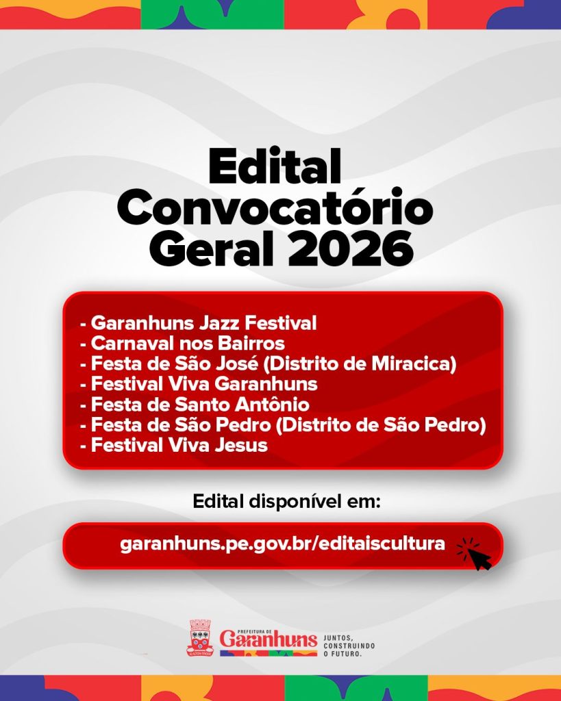 A Prefeitura de Garanhuns, por meio da Secretaria Municipal de Cultura, abre as inscrições para o Edital Convocatório Geral de 2026, que irá selecionar propostas artísticas e culturais para compor a programação dos eventos do Ciclo Cultural 2026 no município, com exceção do Festival de Inverno de Garanhuns.