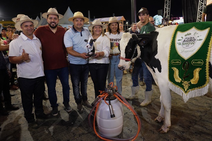 Ao lado do prefeito Pedro Pilota, Regina participou da entrega das premiações aos vencedores do torneio leiteiro e demais competições da feira, reforçando seu vínculo com o setor agropecuário, base essencial da economia local.