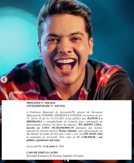 A Prefeitura de Arcoverde divulgou a contratação do cantor Wesley Safadão para o São João 2026, com valor total de R$ 1.500.000,00 pelo show. A apresentação está prevista dentro da programação oficial do evento, um dos mais tradicionais do interior pernambucano.