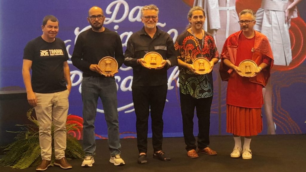 A moda autoral pernambucana, reverenciada no Brasil e no mundo, recebeu um importante reconhecimento, durante o TRAMA MODA PERNAMBUCO. Nesta segunda-feira (8), o evento prestou homenagem a cinco artistas da moda que são referência na ampla cadeia produtiva de moda e artes. Jailson Marcos, Melk Z Dá, Leopoldo Nóbrega, Jorge Feitosa e Beto Normal receberam, por suas trajetórias e influências neste cenário, por meio de uma arte produzida pelo artesão Val Andrade, de Tracunhaém, com intervenção da designer Giselle Rosa.